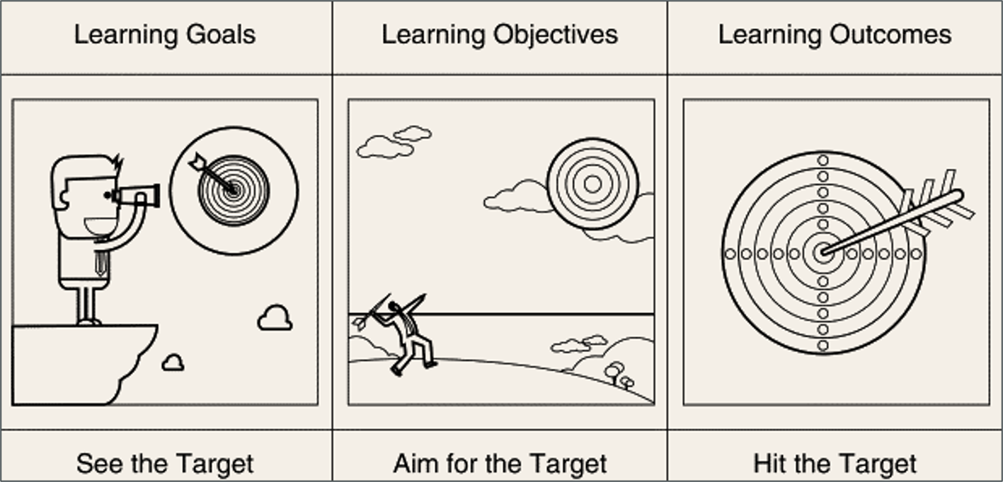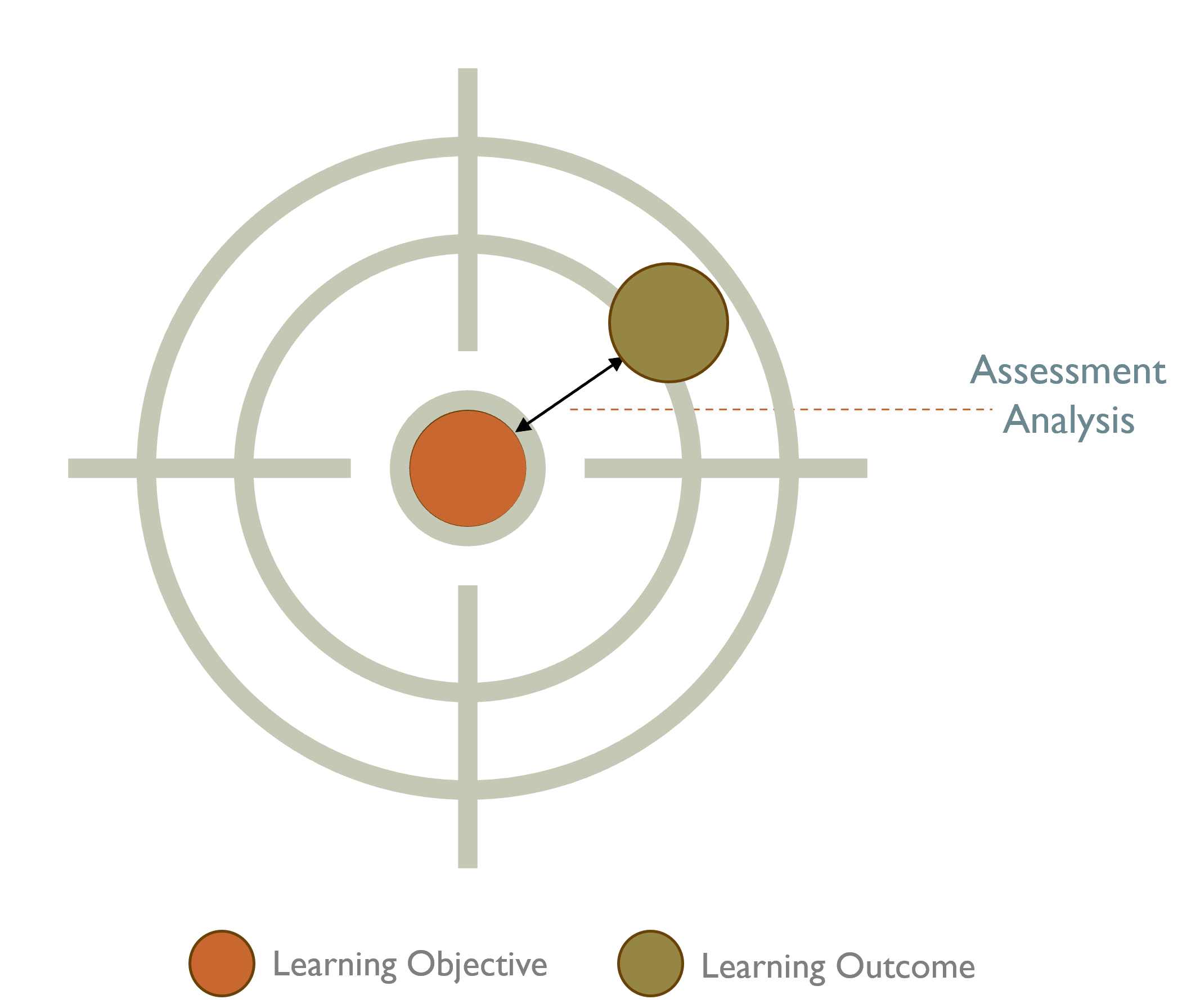 Assessment analysis comes from comparing the learning outcomes with the learning objectives (see diagram). The outcome is what we want to happen; the objective is what actually happens. This comparative analysis is one of the reasons why it is so important to have well-constructed learning objectives.
